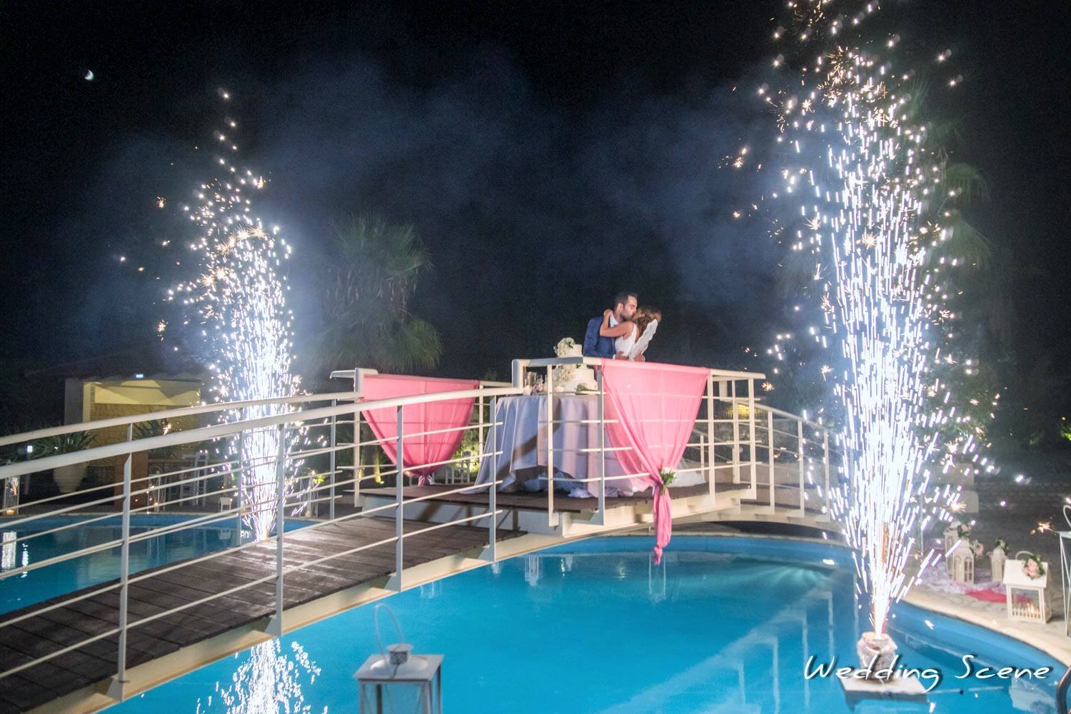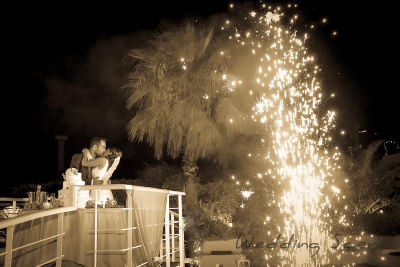 Our team organised the floral decoration of the ceremony and the reception with a perfect wedding cake served with chilled French champagne. For the finale, we offered a spectacular show with fireworks next to the venue pool.