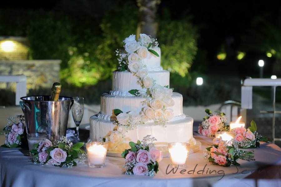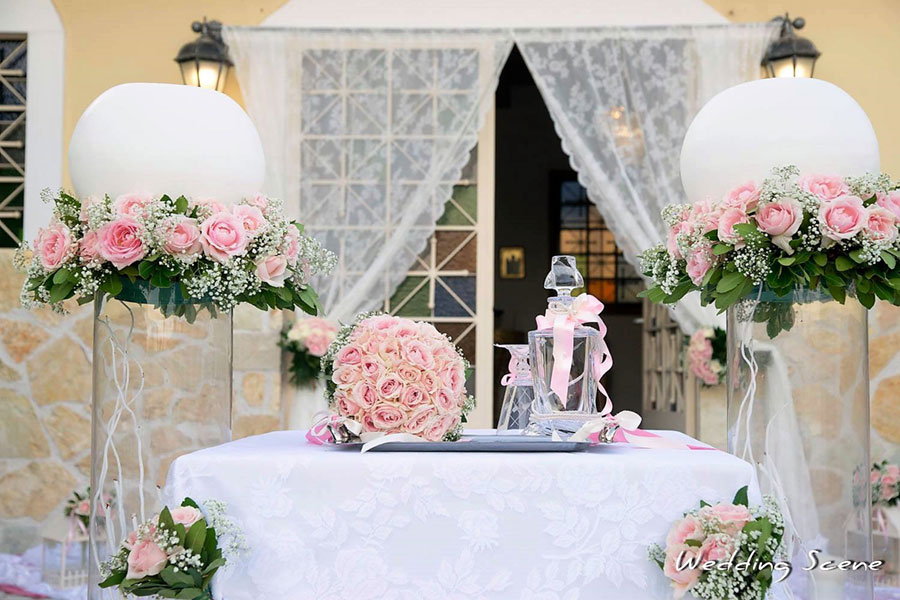 Our team organised the floral decoration of the ceremony and the reception with a perfect wedding cake served with chilled French champagne. For the finale, we offered a spectacular show with fireworks next to the venue pool.